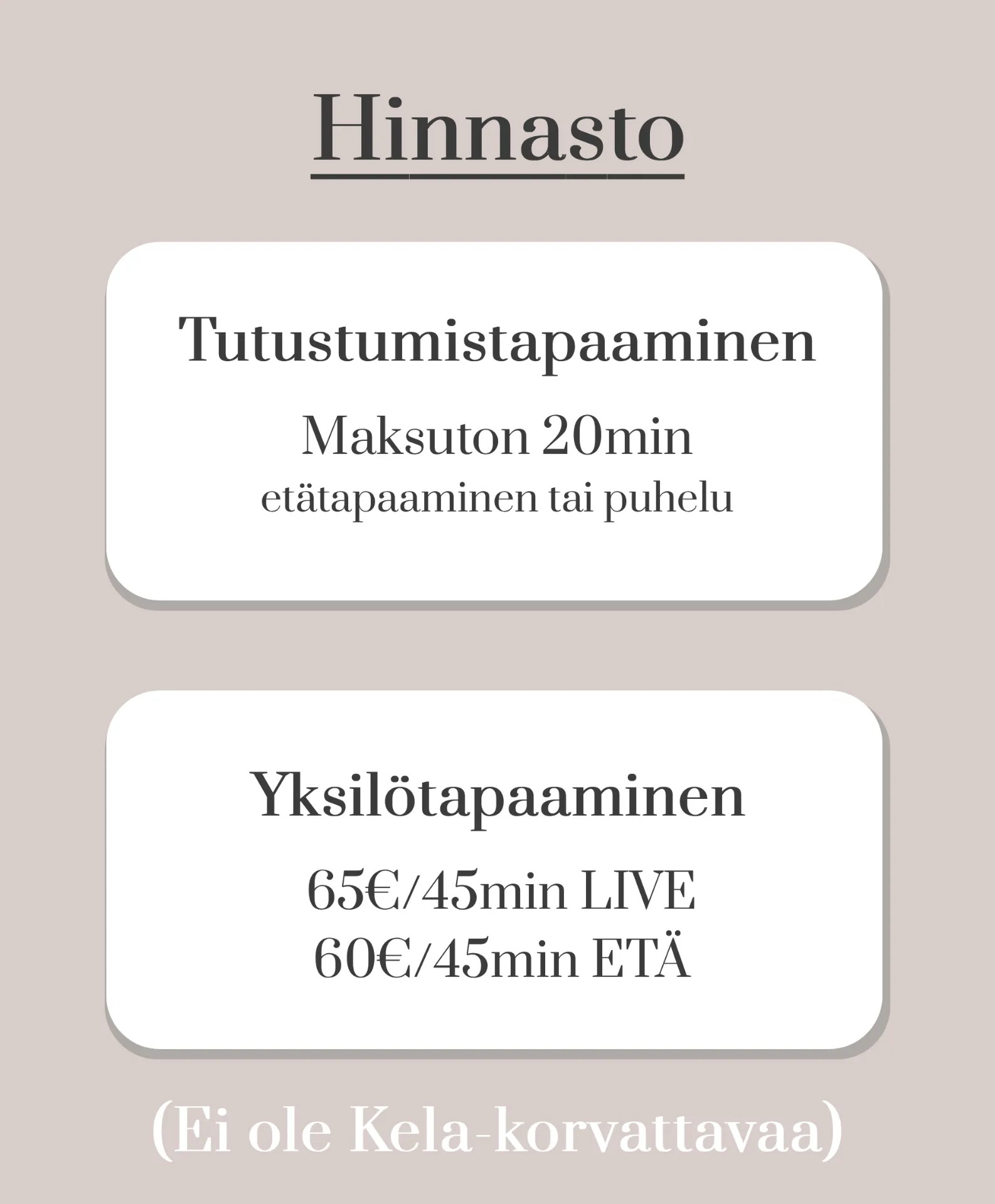 Minulle on tärkeää kohdata jokainen asiakas kunnioittavasti ja yksilöllisesti – sinun tarinasi, tunteesi ja tavoitteesi ovat työskentelymme keskiössä.